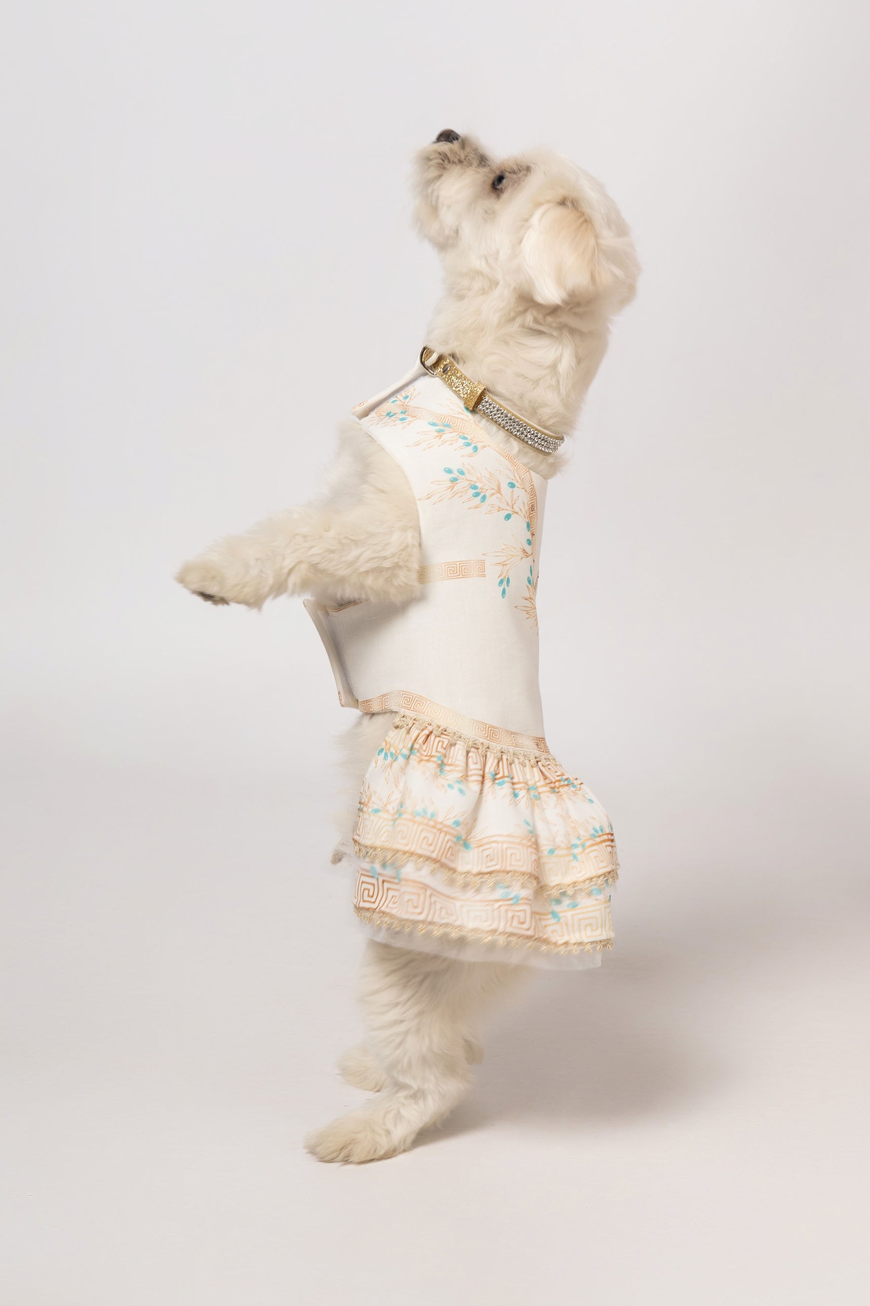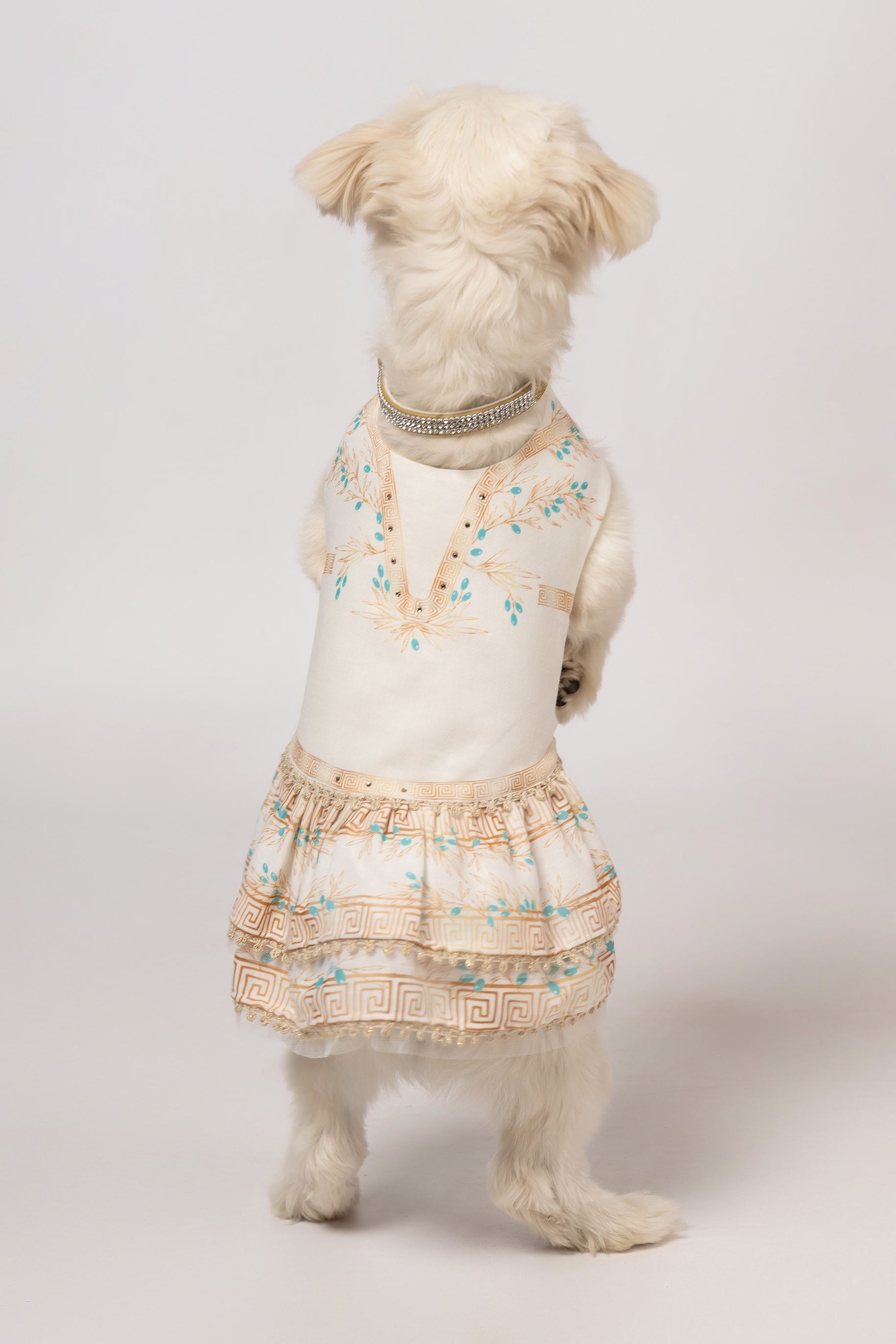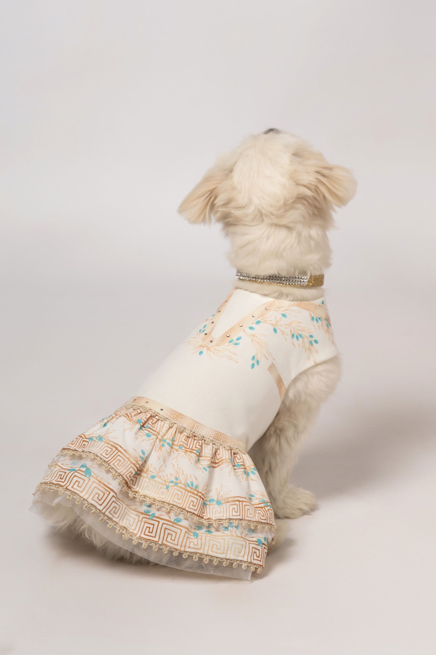This charming dress for girls showcases a delightful pattern of gold and white meanders with green olive buds, all beautifully made from soft, smooth white linen fabric.