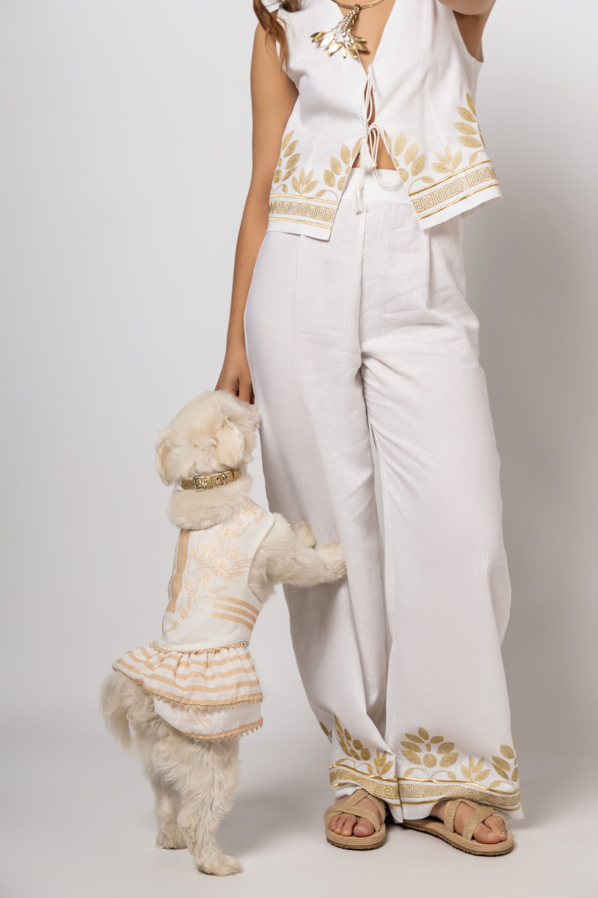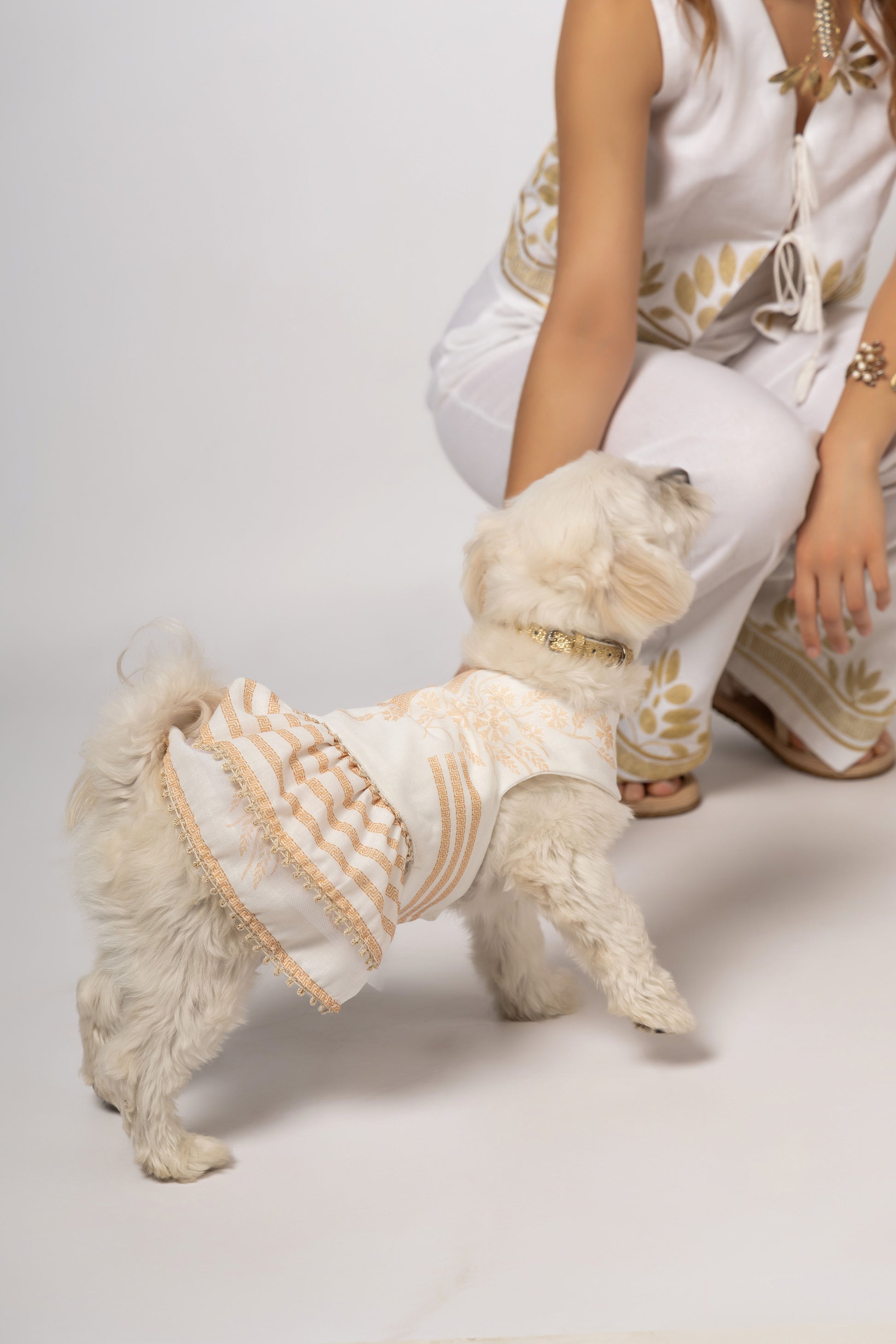 This pet girl dress features a gold and white meander and flower pattern expertly crafted from smooth white linen fabric.